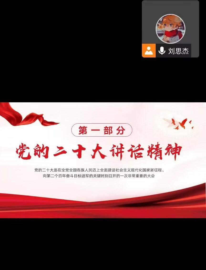 首先,主持人夏娇同学带领支部同学了解学习党的二十大报告,报告提出了新时代文化建设的目标,即“坚持中国特色社会主义文化发展道路,增强文化自信,围绕举旗帜、聚民心、育新人、兴文化、展形象,建设社会主义文化强国。”而后,夏娇同学又带领着支部同学深入学习了《关于进一步优化新冠肺炎疫情防控措施 科学精准做好防控工作的通知》,积极领会中央精神。
