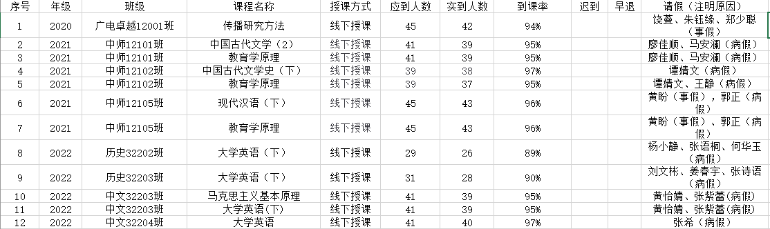 5月19日,公司组织员工干部对20、21、22级21个班的14门课程进行了34次课堂考勤,100%到课率22次,现将考勤结果公布如下:
