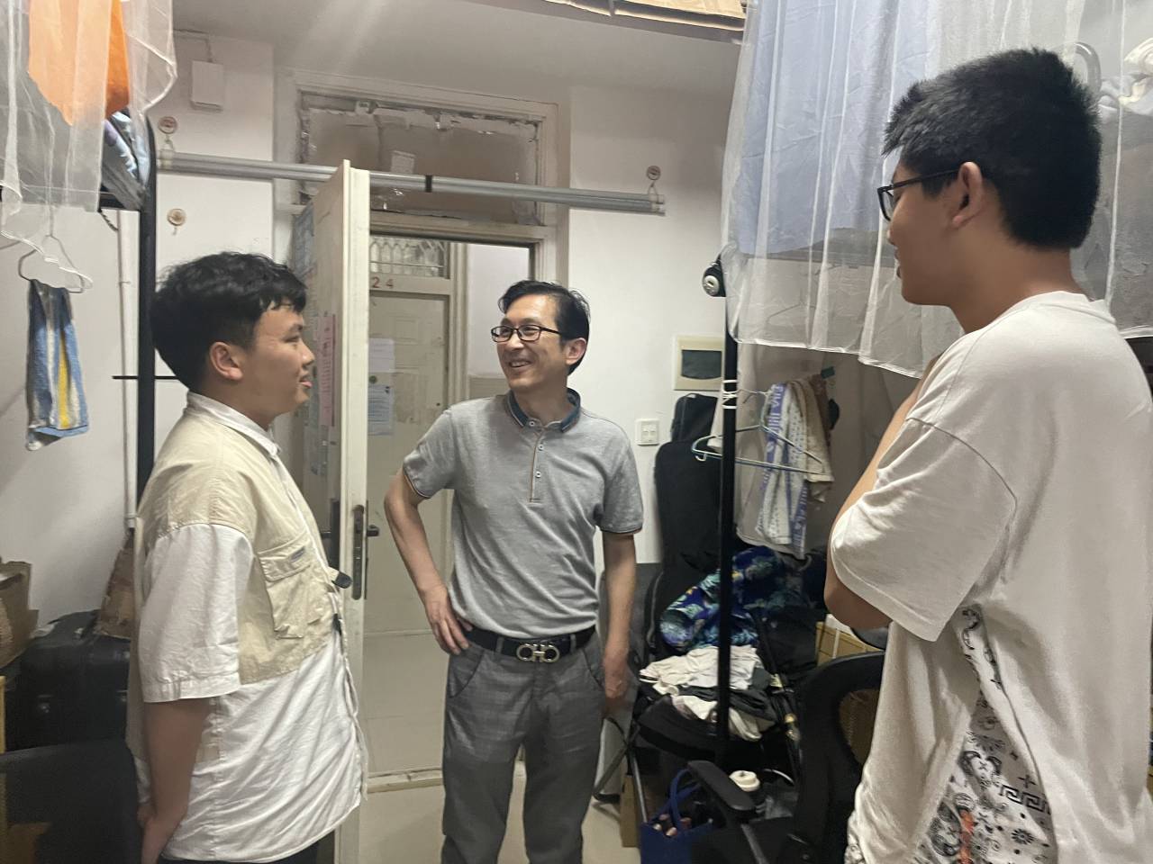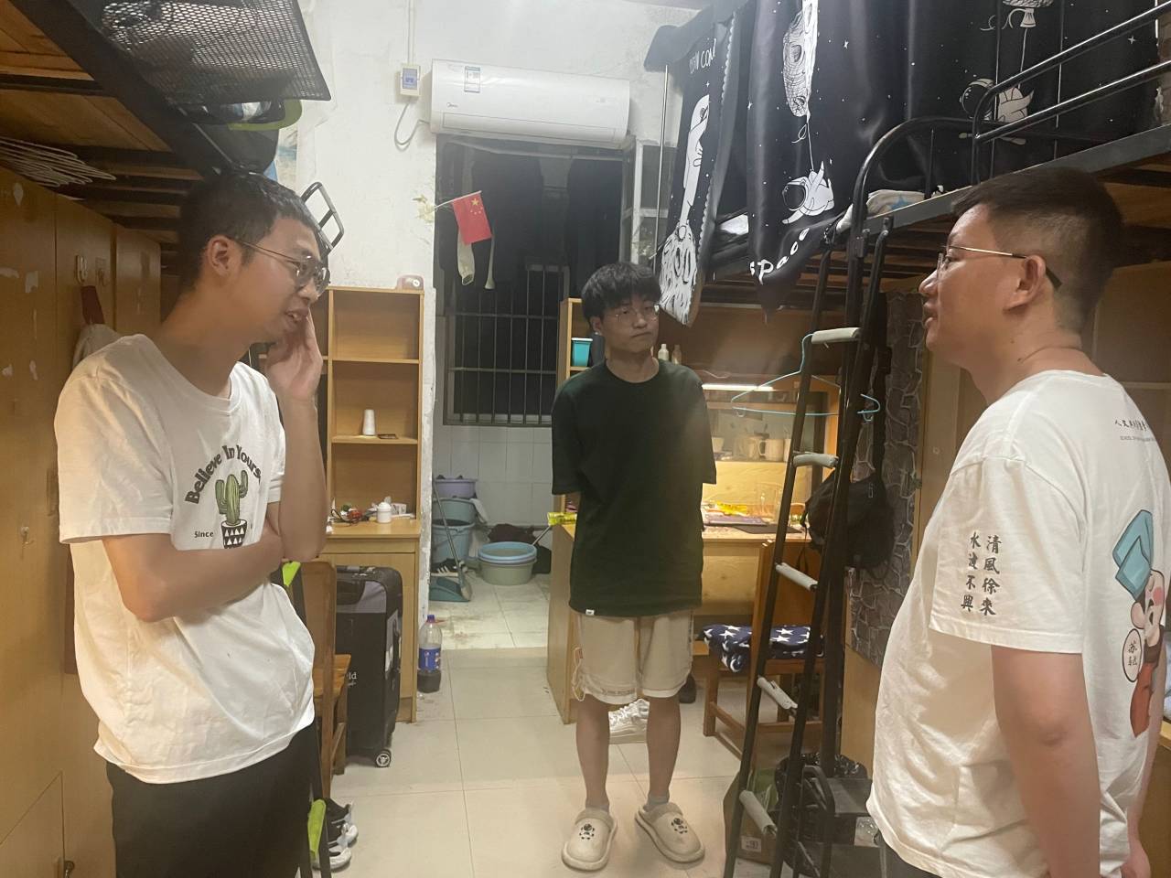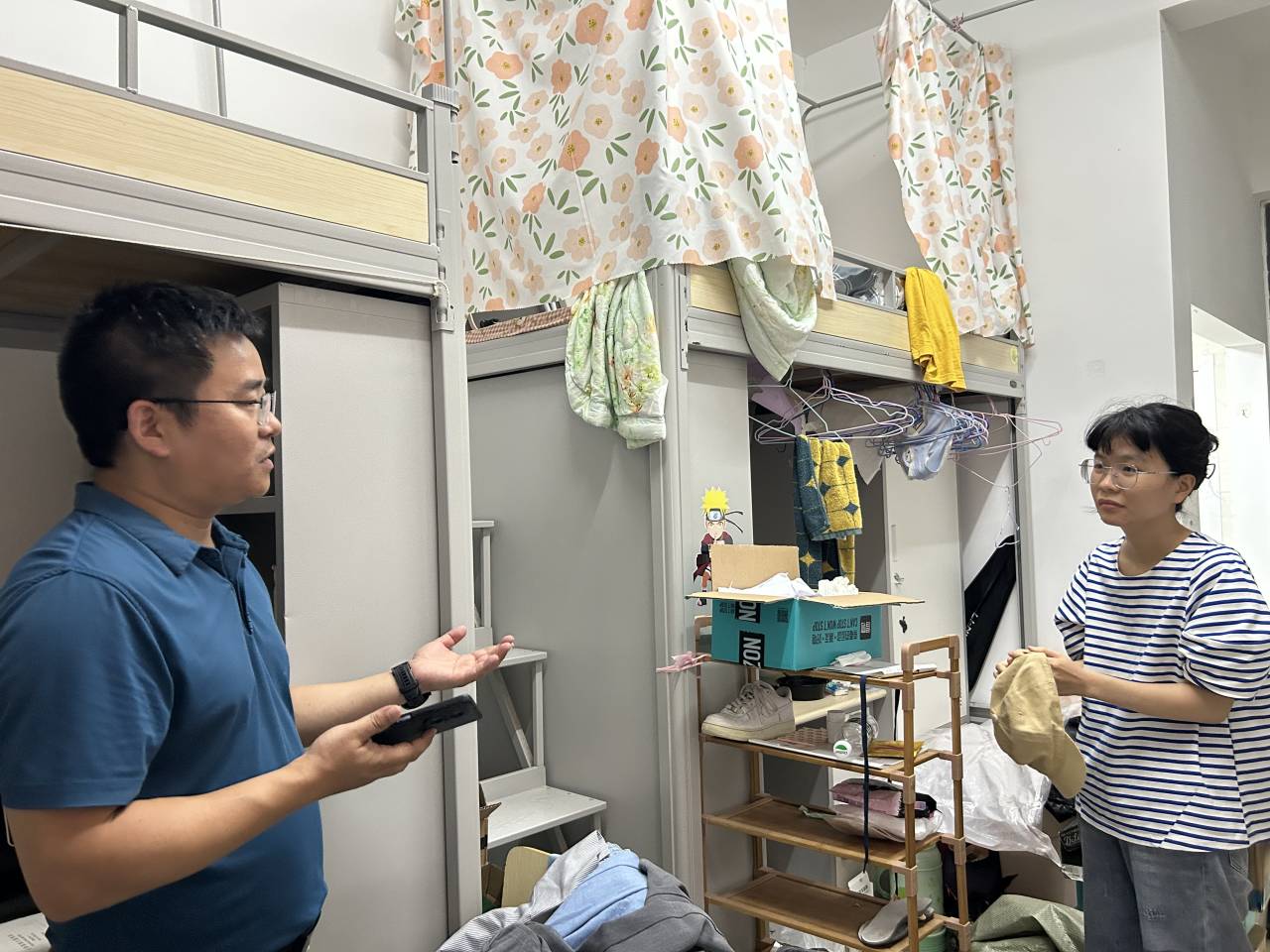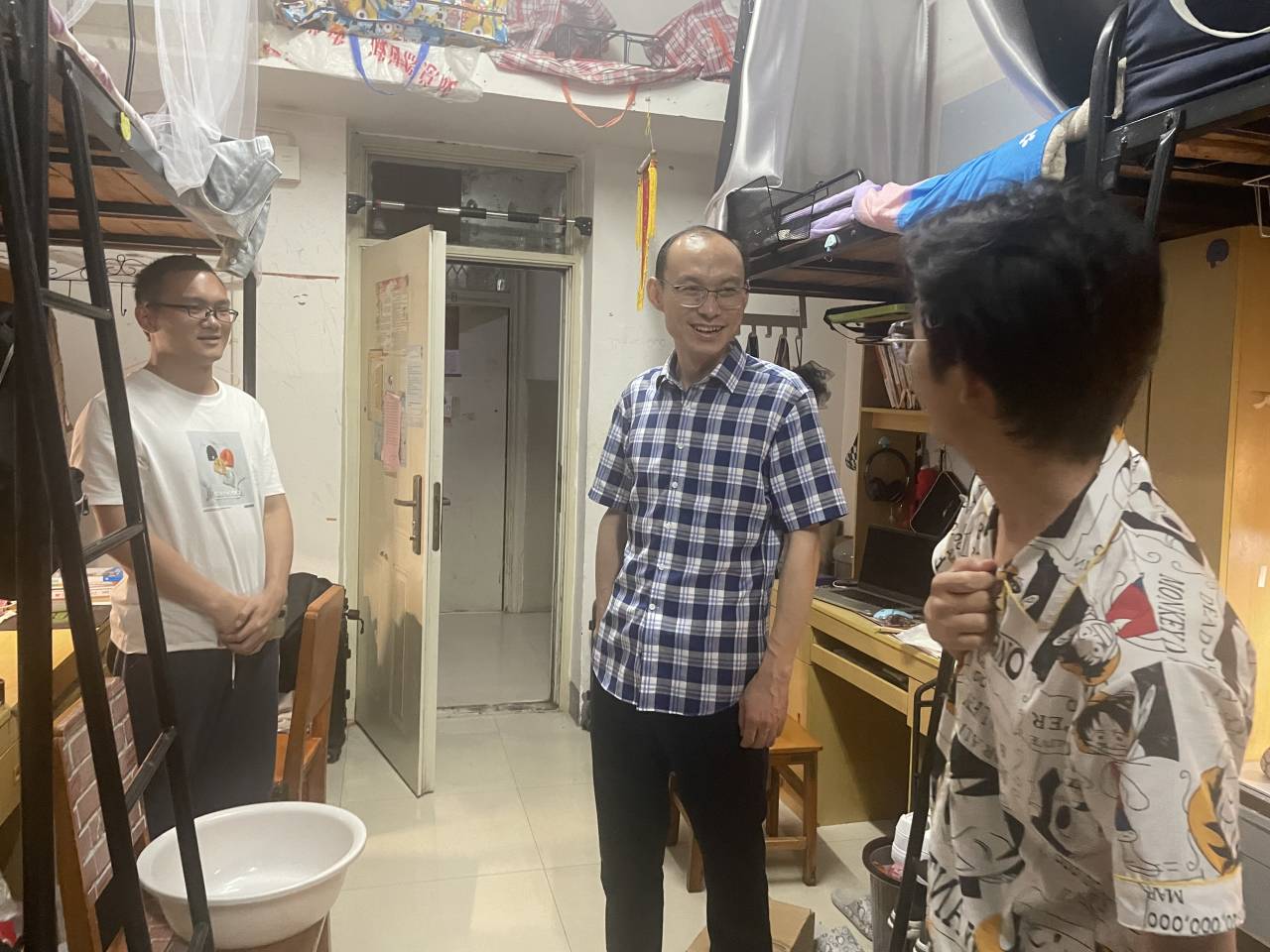 在低年级员工寝室,老师们详细询问同学们在生活和学习中是否遇到困难,并给出有效建议,同时强调电信诈骗、生命安全、诚信考试等事宜。在毕业生寝室,老师们与即将离校的同学亲切交谈,关心询问他们的学习生活、考研深造、就业工作等情况,强调了安全注意事项,鼓励同学们到新的岗位后要主动学习、踏实工作。交谈过程中,毕业生们表达了对学院领导、老师的感谢和对母校的眷念,纷纷与老师们合影留念。