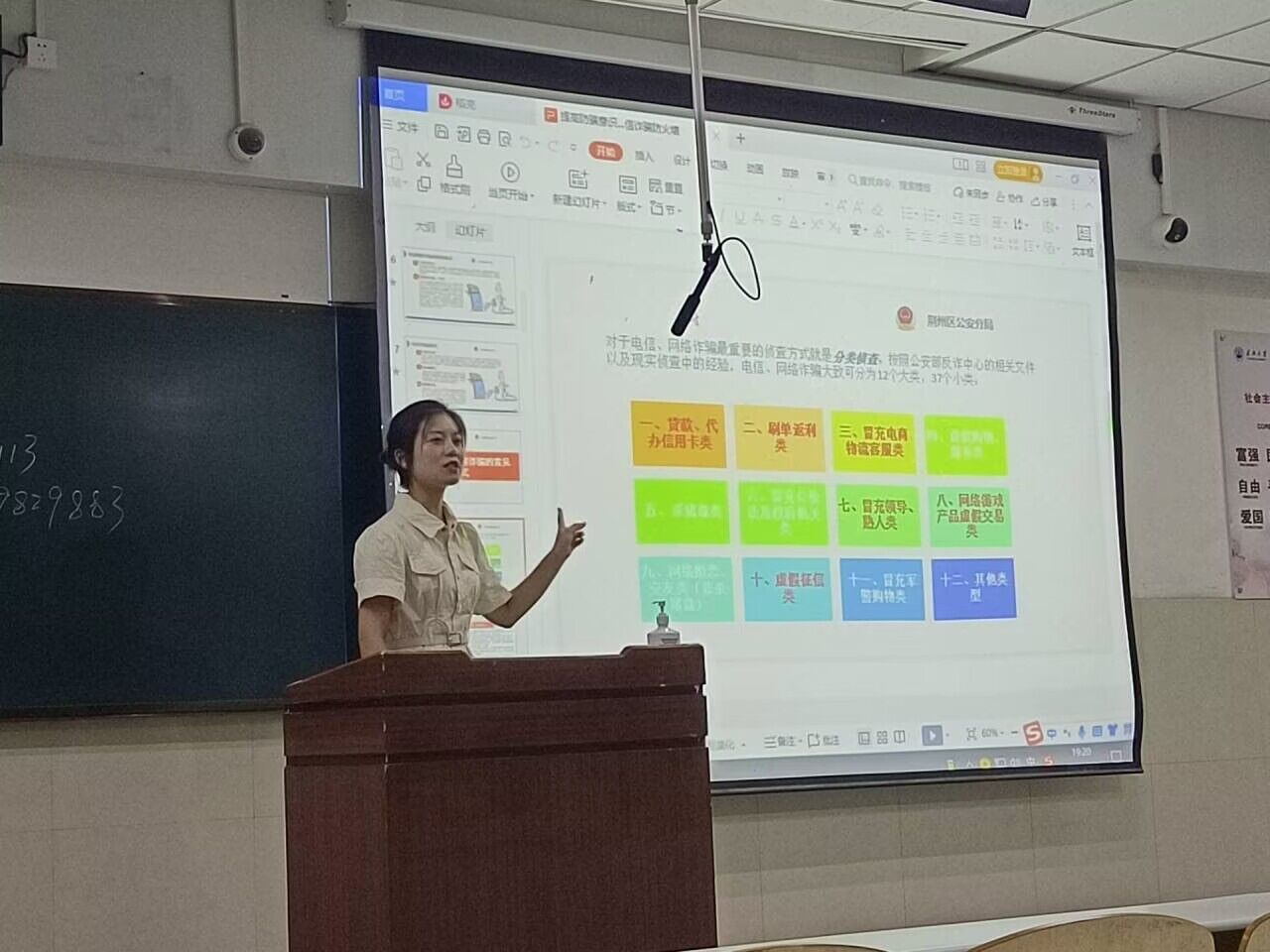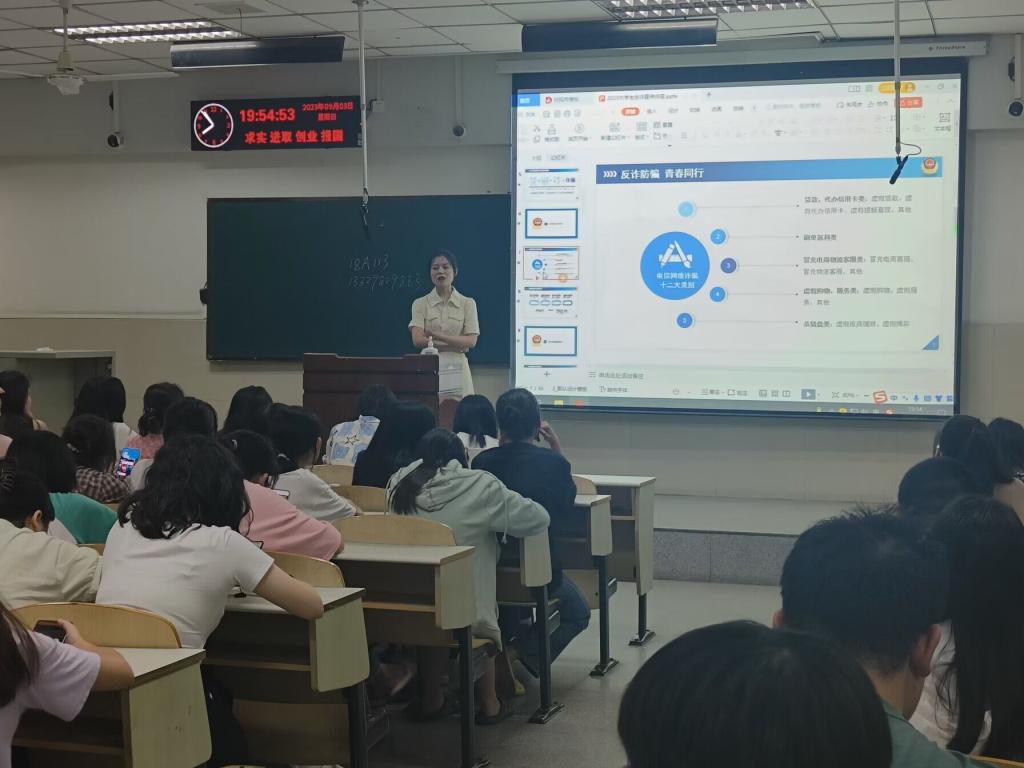 专题班会从电信诈骗基本介绍、了解电信网络诈骗类别、如何识别防范电信诈骗、防诈骗安全知识宣传以及遭遇电信诈骗如何及时恰当采取措施共五部分展开讲解,通过典型案例讲解揭秘常见诈骗套路,为同学们讲解电信网络诈骗的双面影响,提醒同学们积极参加防诈安全知识宣传,自觉提高防范能力。