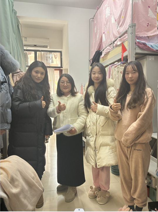 本次检查主要围绕员工宿舍内是否存在私拉乱接电源,储藏使用大功率违规电器、明火设备、易燃、易爆、强腐蚀性违禁物品和带电瓶车及电池进入宿舍充电等安全隐患。检查过程中,大部分宿舍的整体情况良好,地面无杂物堆积,房间干净整洁,物品摆放有序,学习氛围浓厚,室友关系融洽,展现了良好的精神面貌。对于发现的私拉电线问题,立即督促整改,同时对各宿舍同学进行冬季安全用电宣传教育。最后,陈娟老师提醒同学们要注意劳逸结合,关注身心健康,增强自我防范意识。