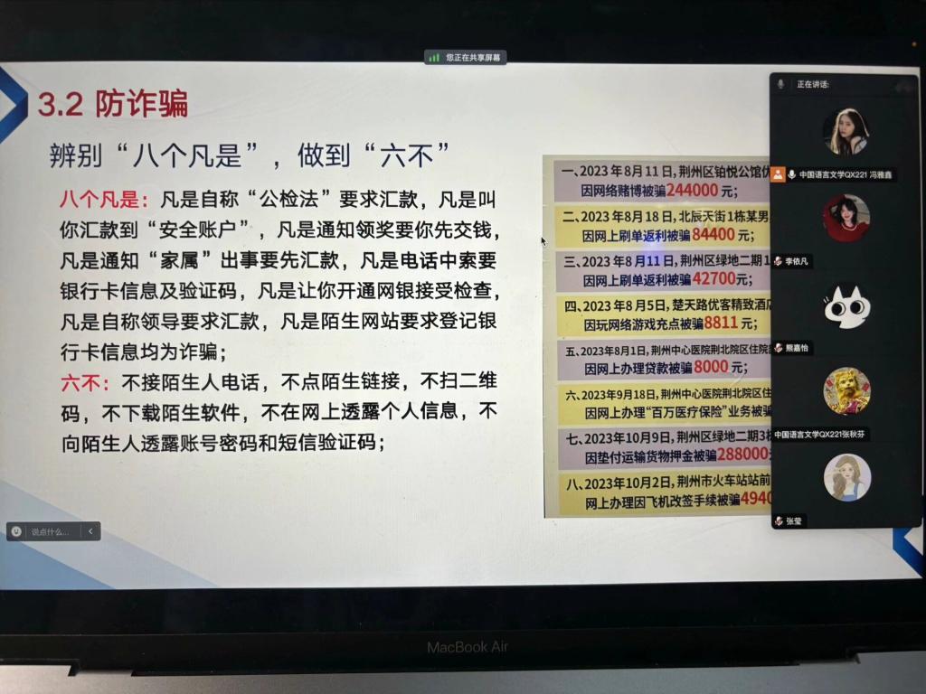 首先,各班通过安全微视频、典型安全事故案例分享等形式,开展了防溺水、防诈骗、防欺凌、抵制网络不良言论等安全常识教育,增强员工的安全防范意识;其次,班会要求同学们认真做好离校、返校的登记工作,严格落实请销假和按时返校制度,强调遇到紧急情况或危机情况要及时上报;最后,提醒同学们做到安全出行、消除安全隐患、小心提防诈骗。