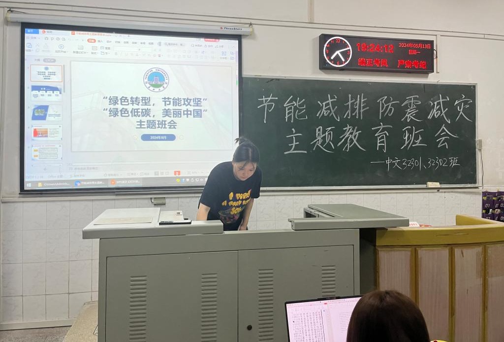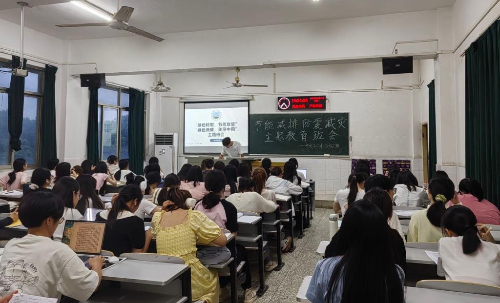 组织开展防灾减灾知识公益宣传活动,各班级积极召开“绿色转型,节能攻坚”“绿色低碳,美丽中国”主题班会。2023级本科生利用晚自习时间,统一组织班会和收看相关视频,并开展讨论交流活动;高年级同学利用课余时间,以班级为单位或以宿舍为单位组织观看、讨论。邓哲今同学说:“绿色低碳和我们每一位同学都息息相关,要从我们身边的小事做起,可以引导同学们规范使用电动车,并组织开展规范停放电动车的志愿服务活动。”
