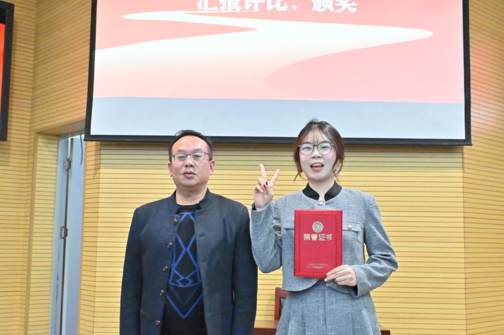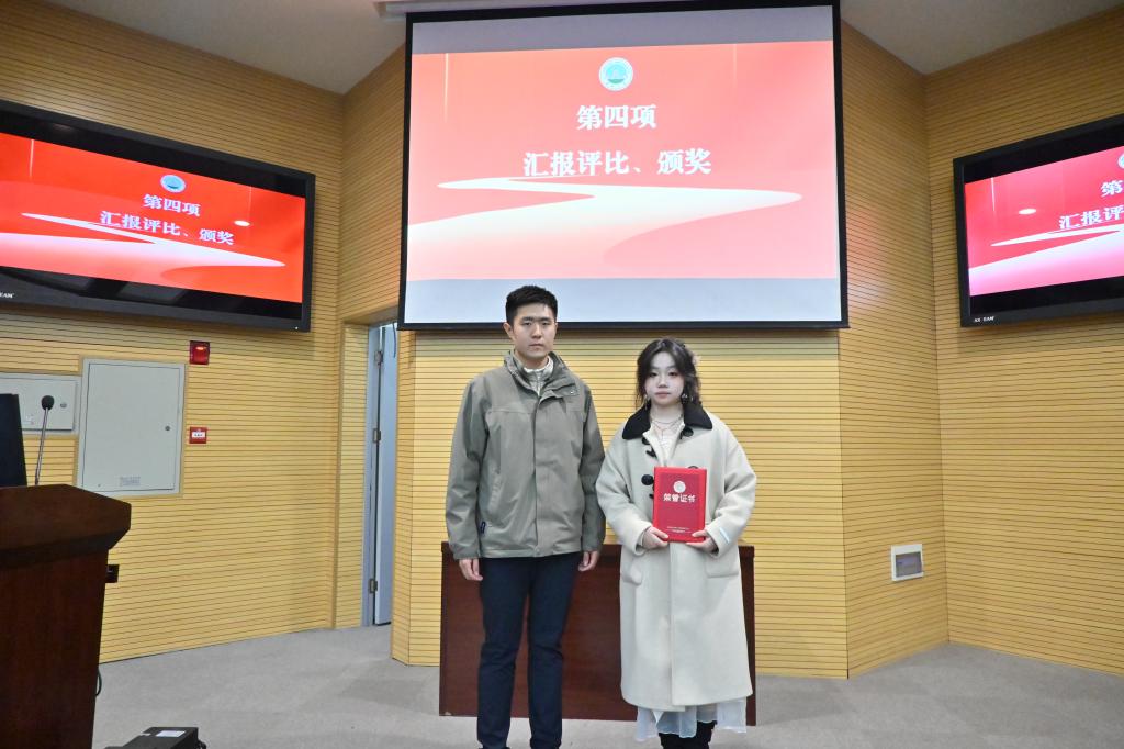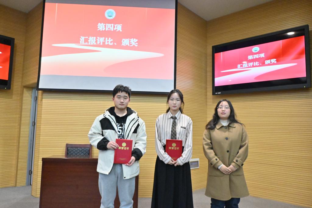 仪式还就汇报展示进行了评比。中文32402班王泫月同学获得一等奖,新闻32401班王晓同学获得二等奖,历史32402班高志帅、中文32404班余秋雨同学获得三等奖。