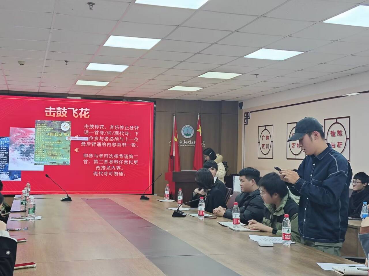 在文章创作心得分享环节,叶熙源、王嘉瑞、侯一鸣等同学逐一走上讲台,分享他们在创作过程中的点点滴滴。李淼同学分享的《水问》最具代表性,展现出她对生命与自然的思考,文章语言优美、意蕴悠长,令在场的许多观众赞叹不已。为增添活动的趣味性和互动性,现场特别设置了“击鼓飞花”和“看图飞花”两个别出心裁的诗歌游戏。随着现场的音乐起伏,同学们热情地参与进游戏中,背诵不同类型的诗词或现代诗,作品种类丰富,展现出参与者扎实的诗词功底。