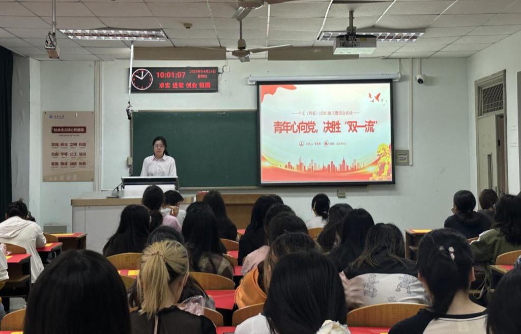 (通讯员 张喆)2025年4月24上午10时,中文(师范)12301团支部举行了“青春心向党,决胜‘双一流’”主题团日活动,参会人员有中文(师范)12301班全体成员、学院各支部团支书及学院辅导员耿传令。