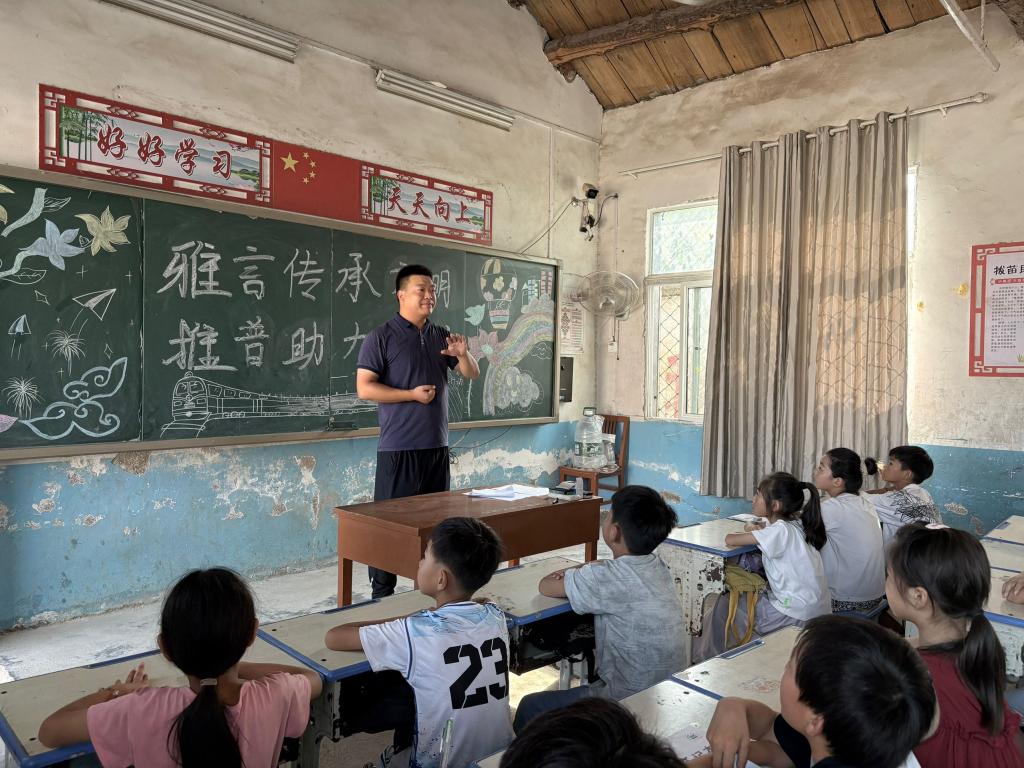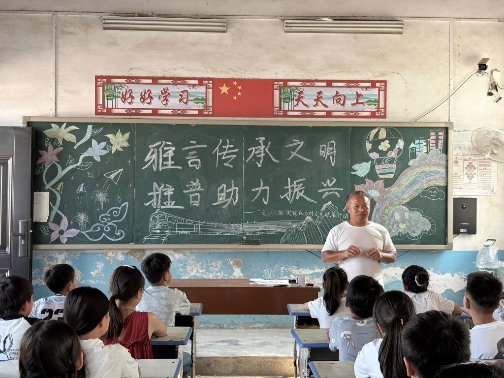 随后,学院带队老师耿传令致辞。他深入浅出地阐述了推广普通话在新时代背景下的重大意义。“同学们是广袤乡村的希望,学好普通话在拓宽视野方面具有不可替代的作用。我们此行的目的,正是要发挥专业所长,将语言的种子播撒在乡村的沃土上,让它成为助力孩子们成长成才、推动乡村文化振兴的蓬勃力量。”