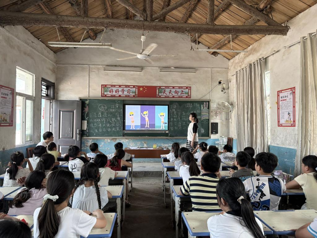 在轻松愉快的师生自我介绍环节,陌生的隔阂迅速消融。实践队员们用清晰流利的普通话自我介绍,分享对这次实践活动的期待。孩子们虽然略带羞涩,但在志愿者的鼓励下,勇敢地用带着乡音的普通话自我介绍。教室里响起阵阵鼓励的掌声和友善的笑声,为后续的活动奠定了良好的情感基础。开班仪式结束,实践队成员胡文博带来了一场别开生面的“经典润乡土”诗词鉴赏课,他选择的篇目是文天祥气壮山河的《过零丁洋》,生动讲述了文天祥在国家危亡之际的坚贞不屈,阐释了“丹心”代表的爱国情怀与崇高气节。实践队成员姜明圻紧接其后,带来一堂至关重要的“守护生命,预防溺水”安全教育课。暑期是青少年安全事故的高发期,特别是农村水域较多,防溺水教育刻不容缓。