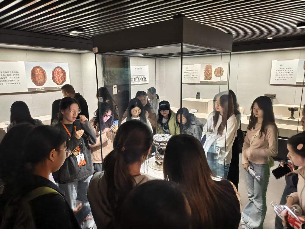 在博物馆志愿讲解员的引导下,师生依次参观了凤凰山168号汉墓展区、楚纹饰漆器展区以及本次特展的核心展区——马山一号楚墓织绣品陈列。从织造精湛的先秦丝绸残片,到纹饰瑰丽的漆木虎座鸟架鼓;从记录历史的汉代竹简,到保存完好的西汉遂先生干尸,每一件文物都无声地讲述着楚文化“筚路蓝缕、以启山林”的开拓精神和“兼收并蓄、汇通南北”的包容气度。展览现场气氛热烈,同学们在观摩与交流中,进一步加深了对“楚文化作为中华文明重要组成部分”的深刻理解。