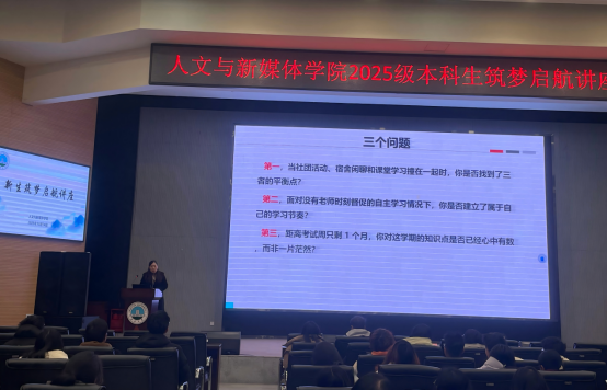 冯翠丽作总结讲话。她首先对两位老师的精彩分享表示感谢,卢老师深耕的荆楚文化研究藏着人文与新媒体专业的成长密码,向老师介绍的AI工具则是同学们提升效率的“专业助手”,鼓励新生既要扎根传统文化土壤,传承楚人开拓进取的精神品质,也要保持开放心态,主动拥抱科技变革,在人文与科技的融合中找准自身定位。最后她以“三月积淀,蓄力应考”为题,精准指出新生学习生活中存在的三个关键问题,并针对性地提出三个建议,希望同学们进一步凝心聚力,合理规划时间,查漏补缺,以扎实的学业为老员工涯奠定坚实基础。