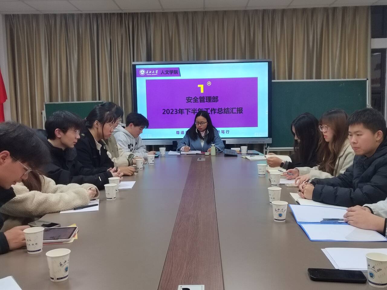 (通讯员 李周荣 王浩然)3月8号晚7时,院员工会在文科楼701会议室召开第二十届团委、员工会新学期部门例会,就员工安全教育、资助育人等工作进行安排、交流,学工办主任龚玉云老师,员工会主席团成员全杰、熊柳苏,员工会安全管理部、心育部全体成员参会。会议由全杰同学主持。