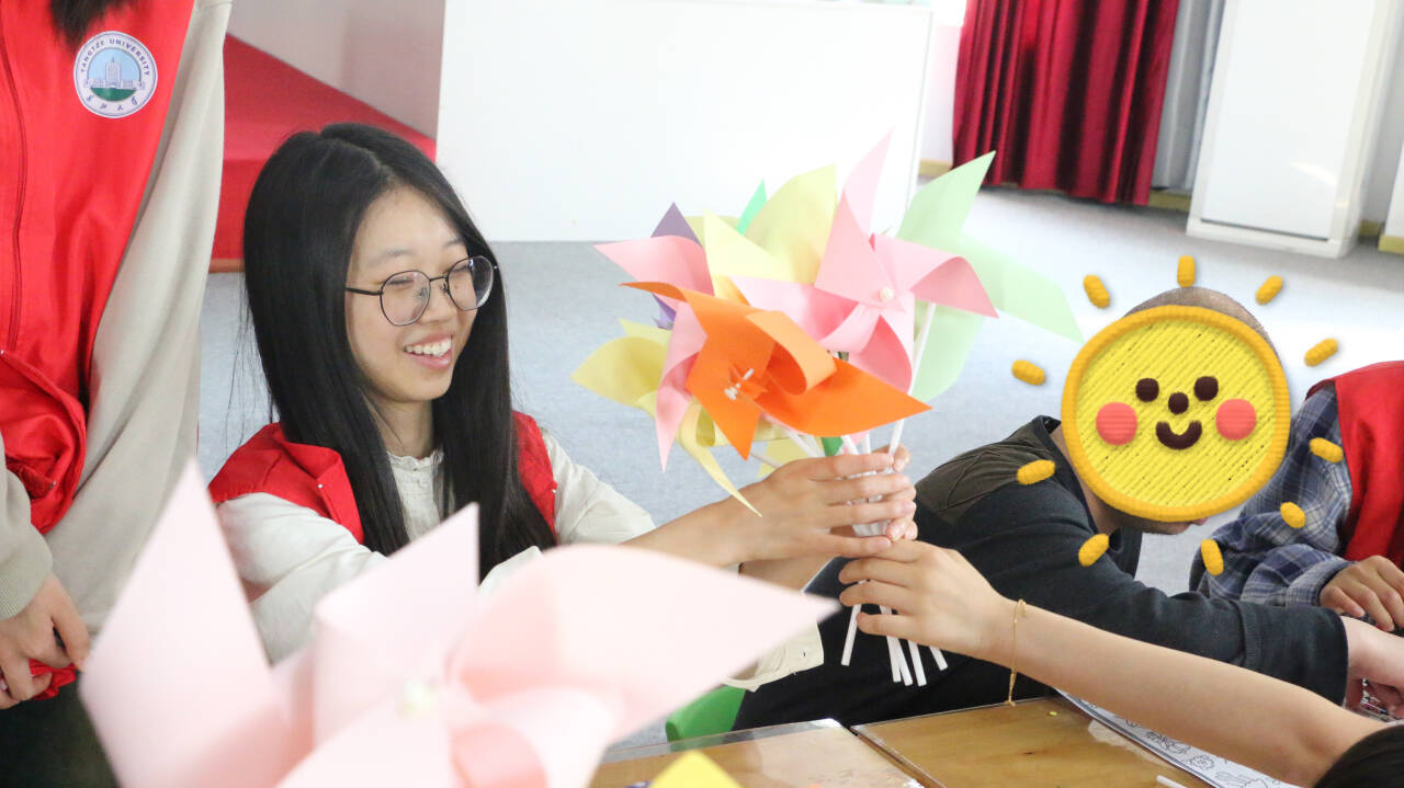 在风车制作手工课上,现场志愿者们分工明确,发卡纸、做示范,手把手教学,让往日安静的会场一下热闹了起来。一双双热情的手重叠交错,一张张含笑的脸充满激情,每一支风车都代表着员工志愿者们的爱心和关爱。