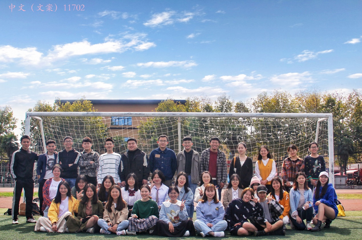 中文(文案)11702班共34名同学,我们来自全国各地,组成了一个团结有爱、共同进步的大家庭。别人眼中的文案人:上得了讲台、办得了会议、写得好文案、做得好广告、当得了秘书,直觉都是创意、下笔当值千金的复合型人才。当然,我们正朝这些目标努力。经过两年半的“修炼”,全班同学已经建立了强烈的专业认同感,形成了“我爱我班、和谐互助;团结友爱、共同进步”的班级理念。