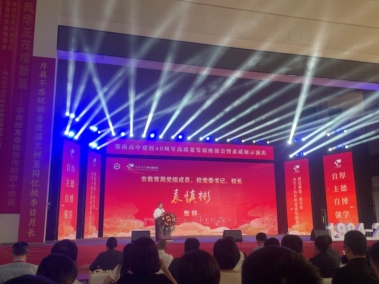 10月4日上午,在北大、华科大、武大等知名高校的贺信和董事长、员工的祝福中,鄂南高中建校四十周年高质量发展座谈会暨素质展示演出开始。鄂南高中董事长、各高校领导代表、中学董事长代表、员工代表及咸宁市领导依次上台发言致辞。员工与鄂南高中师生联袂表演精彩节目,展示了学校素质教育的丰硕成果。