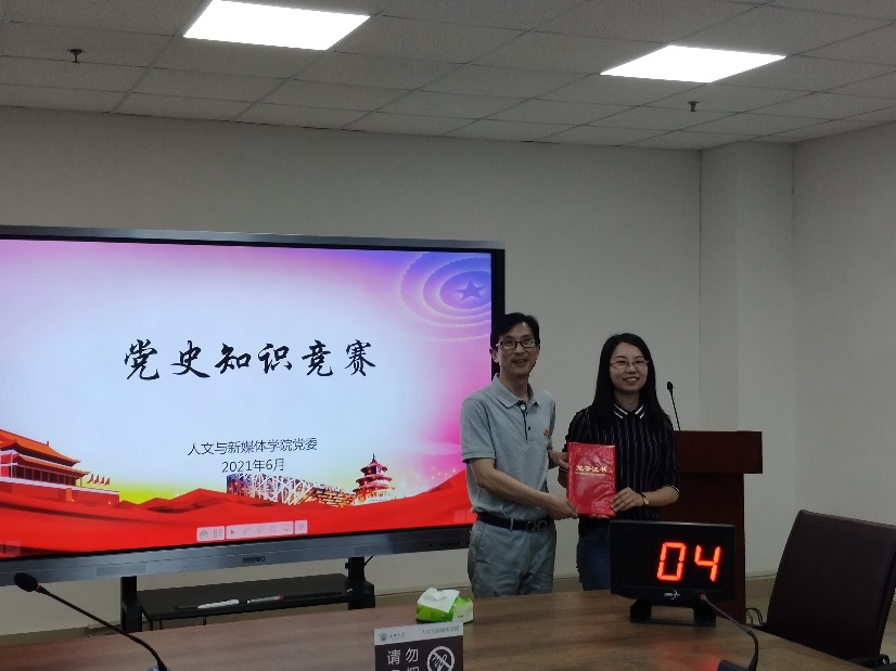 本次党史知识竞赛采用小组抢答形式,两个教工支部各派3名选手回答21道题目,内容涉及党史、军事、时政等多方面内容。比赛中,6位选手精神饱满、踊跃答题,团队成员间合作紧密,比赛现场高潮迭起、掌声不断。最后新闻历史行政教工党支部以1分的优势险胜中文教工党支部,王薇薇老师获“最佳答题选手”称号。