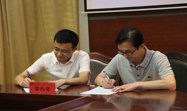 监利中学董事长覃忠介绍学校基本情况,并和公司党委书记杨克非在共建协议上签字。