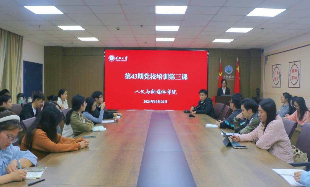 (通讯员 易孝佳/文 游雪莲/摄)深化理论学习,铸就坚强党性。为积极推进新时代党员培养工作,提升党员的政治素养与党性修养,严格把控党员发展质量,10月29日晚19时,学院于文科大楼705室开展第43期党校培训第三课。本次活动由预备党员蒋好主持,研究生第一党支部书记归航与本科生第一党支部书记彭超联袂授课,全体培训学员参与。