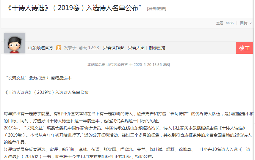 2020年5月20日,中国诗歌官方在线公布了《十诗人诗选》(2019年)入选诗人名单,公司中文(师范)11702班徐惟真同学的30首诗歌成功入选。此书由“长河文丛”编委会委托中国作家协会会员、中国诗歌在线山东频道站站长、诗人书法家周永教授主编,将由山东音像出版社于今年10月左右正式出版,出版后的书籍也将在新华书店的推荐上架进行销售。据悉,“长河文丛”由专业编辑和设计团队倾心锻造,与国家级重点出版社线装书局、山东画报出版社、黄河出版社等联合出版,CIP版本数据可查。
