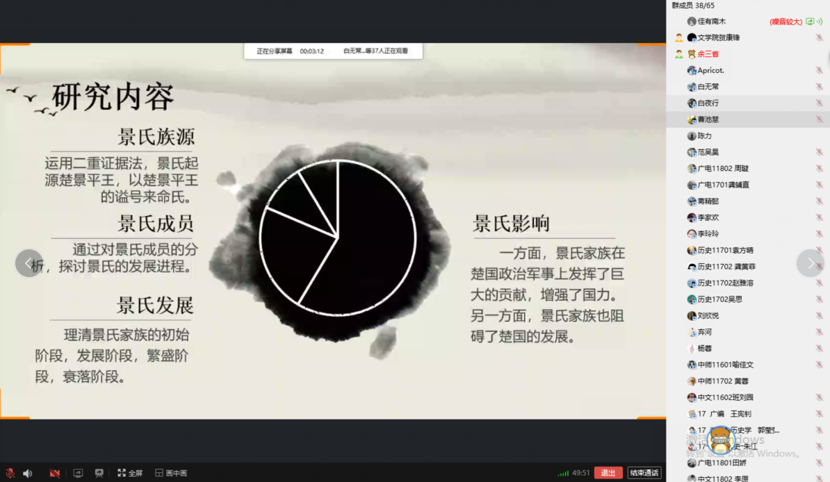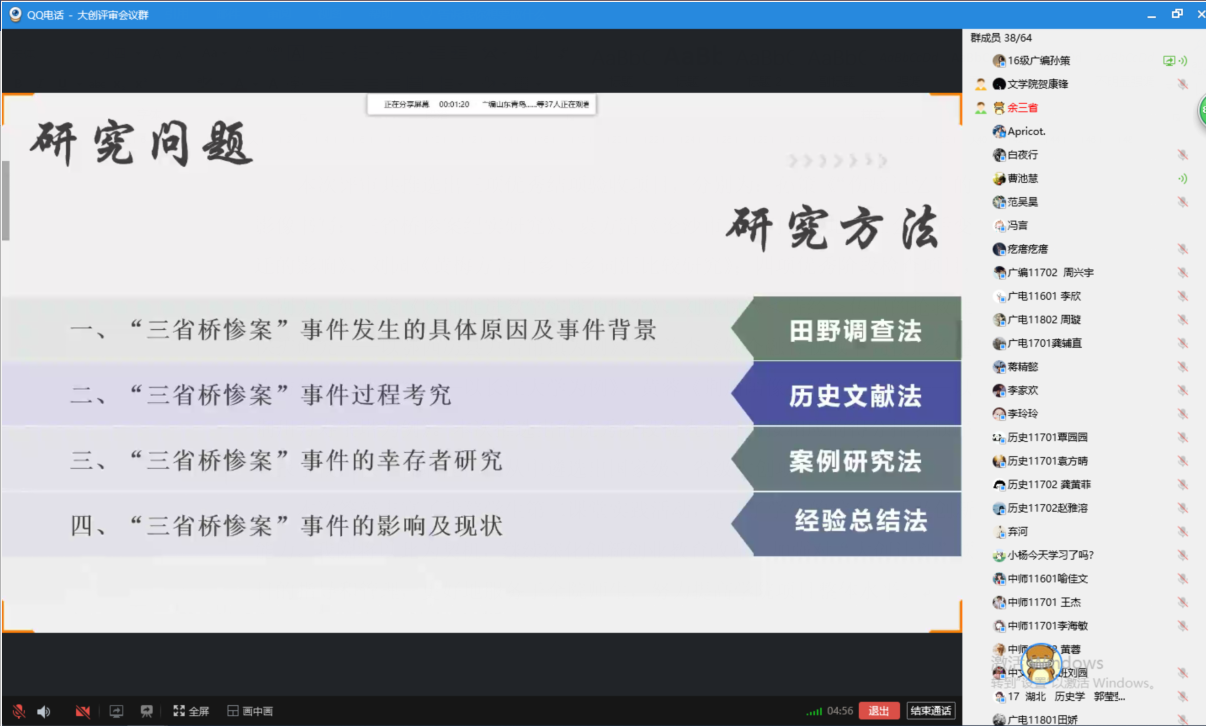 5月11日18:30——22:00,文学院2020年度校级“老员工创新创业训练计划”项目结项验收与阶段检查评审答辩会以网络视频会议的方式举行。本次共有11个结项验收项目与14个阶段检查项目参加答辩,公司教师余静贵、杨蓉、曹池慧、余劲东担任评委。