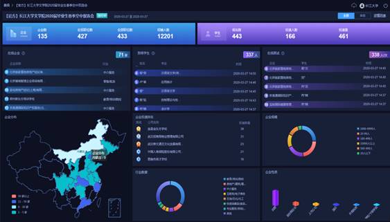 本次双选会从3月3日开始组织宣传,并在25日前发布相应职位收取员工简历,3月27日9:00-16:00正式面试,用人单位和员工进行在线沟通和视频面试。来自河南、四川、浙江、北京、湖北等135家企事业单位报名参会,提供职位数433个,招聘人数达12201人。提供包括教师、管理人员、销售等多种岗位。招聘会吸引文学、信息与数学、外国语、教育与体育等学院的443名同学报名参加, 338人在线面试,共计投递简历461份。