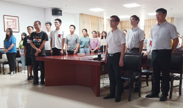 升国旗仪式结束后,文公司党委中心组成员杨克非书记、余劲东副经理、胡世先副书记、陈娟老师、徐东老师陪同假期留校的员工党员、入党积极分子、员工干部代表和2019级新生分别于东、西校区观看国庆阅兵仪式。当五星红旗在天安门广场上再次升起之时,全场师生情不自禁的再次起立,高唱国歌,表达对祖国母亲的深情与热爱。