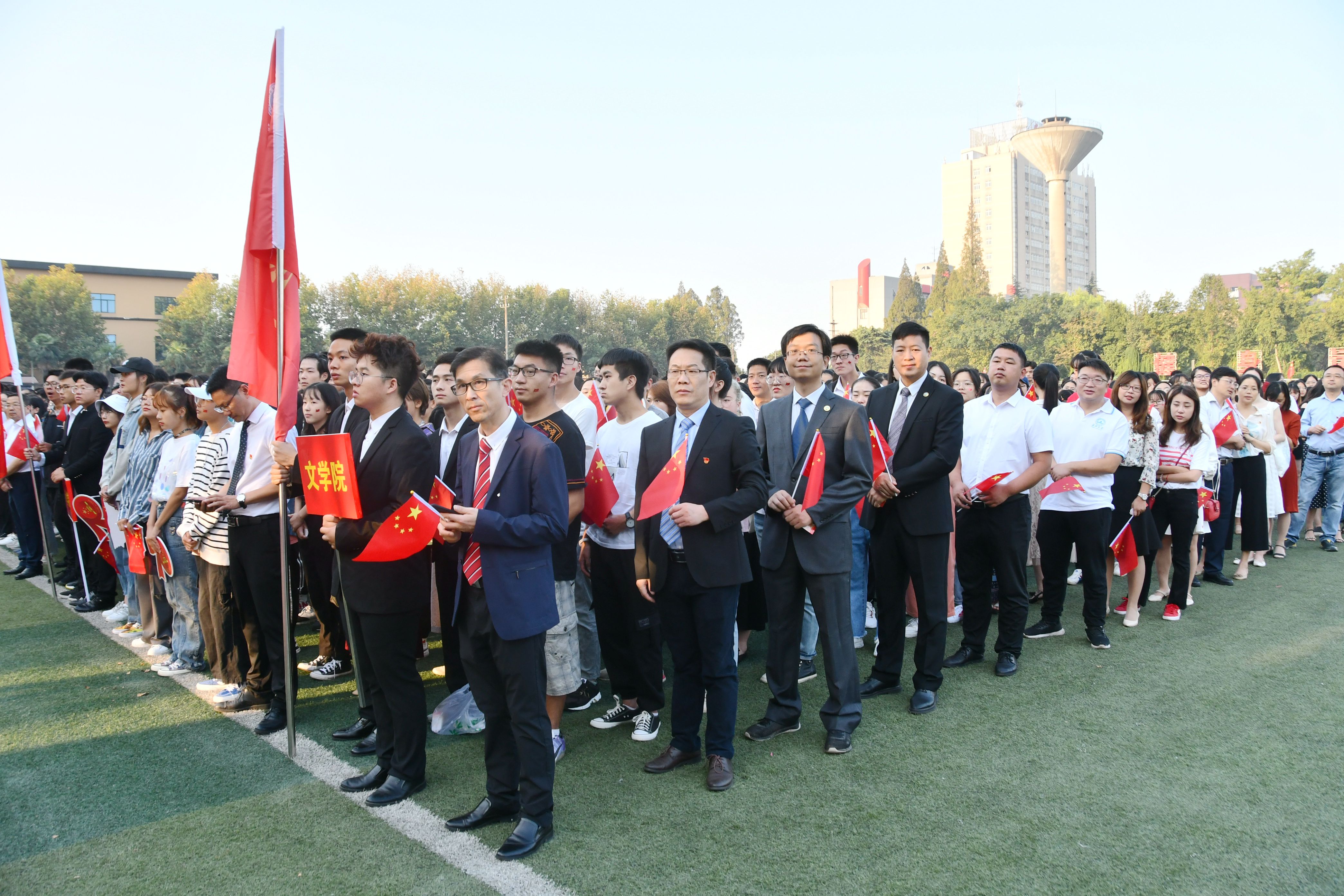 70年初心如磐,70年砥砺前行,70年风雨兼程。在中华人民共和国70岁生日当天早上7点,文学院全体院领导及留校师生齐聚东、西校区操场,参加国庆升旗仪式,以这一庄严神圣的方式向伟大祖国、伟大时代致敬献礼!文学院师生与学院书记杨克非、经理何世龙一起挥舞国旗,齐唱《我和我的祖国》,表达了对祖国生日的祝福。