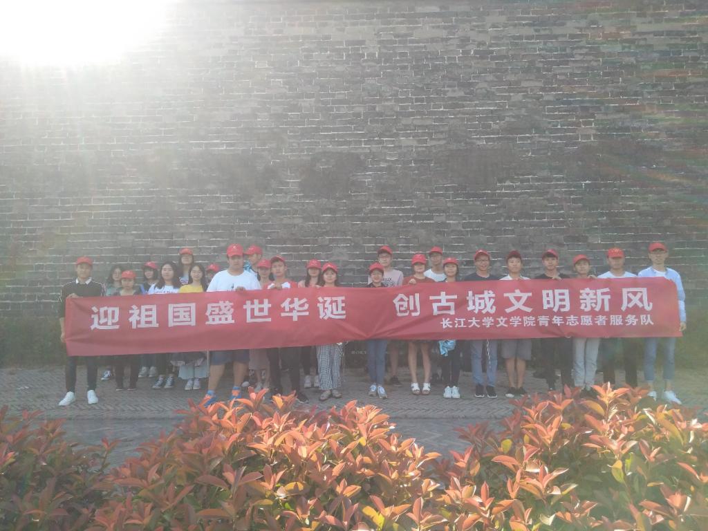 (通讯员 孙桥)为响应中共十九大、团十八大精神,争当四有青年,同时为迎接十一国庆节的到来,贯彻落实文明荆州创建活动。文学院青支队联合文学院团委员工会以及文学院16级预备党员组成志愿者团体共同发起以“迎祖国盛世华诞,创古城文明新风”为主题的城墙清扫志愿活动。