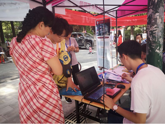 在学院报到注册点的现场,志愿者们来回穿梭,引导新生完成注册手续、帮拿行李、带领新生熟悉宿舍情况与校园环境。