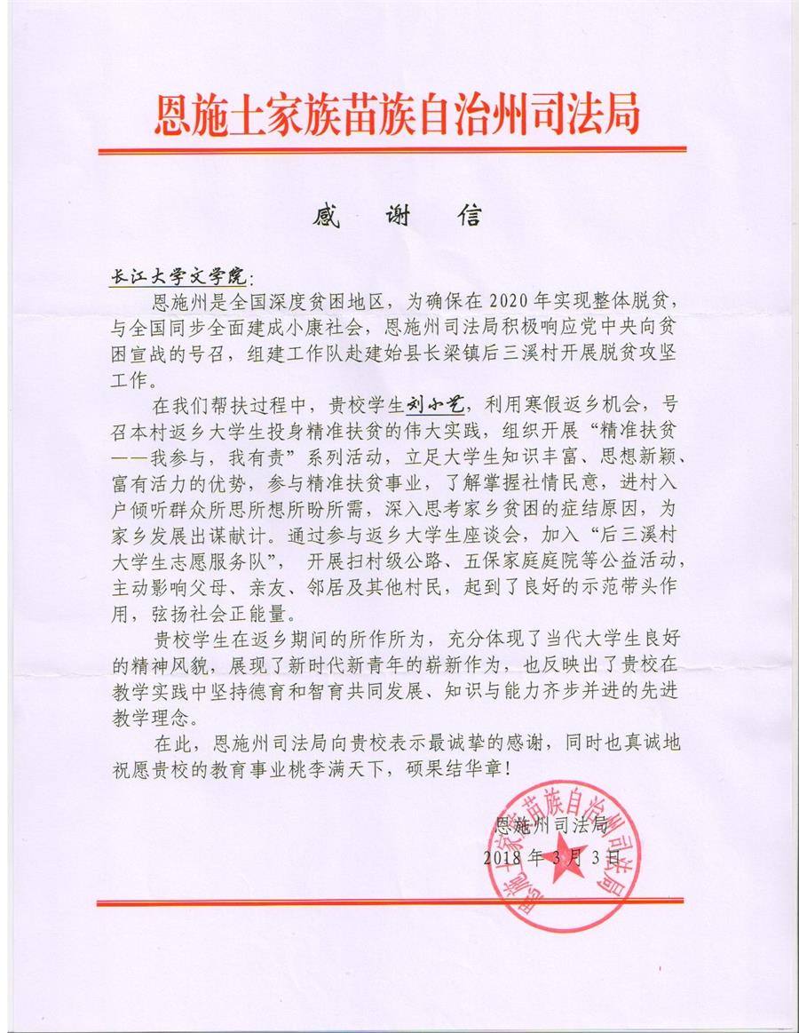 (通讯员 靳婷婷 )3月15日,文学院收到一封来自恩施土家族苗族自治州司法局的感谢信。因公司中文11401班刘小艺同学在寒假返乡期间积极参与并协助开展“精准扶贫――我参与,我有责”系列活动,恩施州司法局专门写信表示鼓励和感谢。