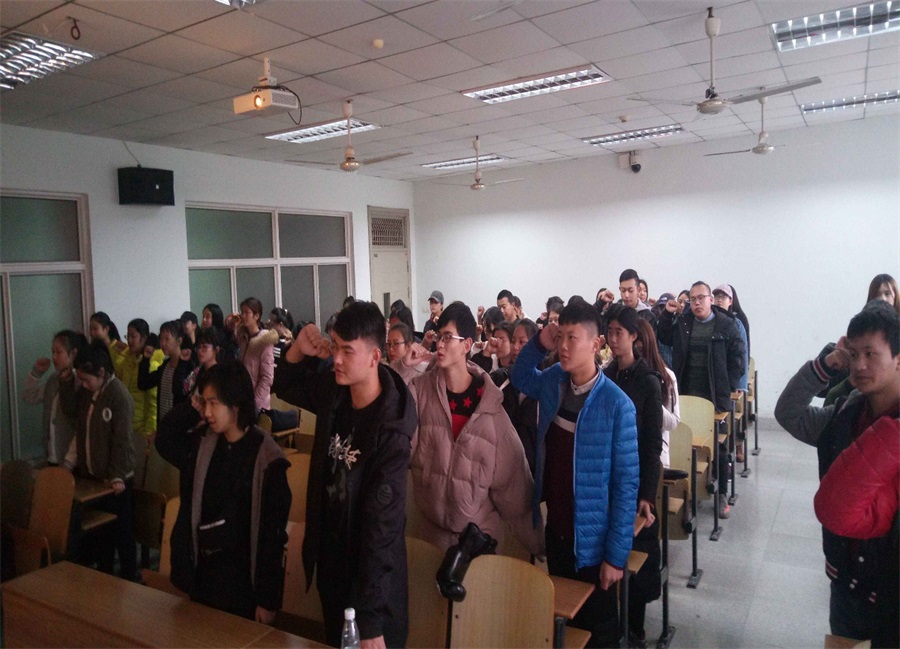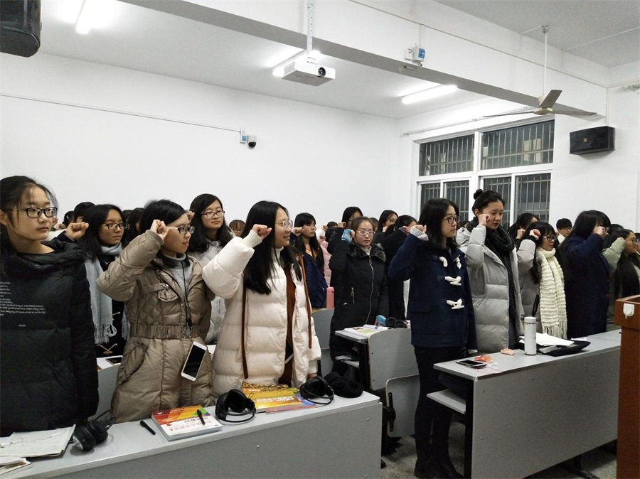 班的同学们正在团支书李瑾雯的带领下庄严宣誓。宣誓结束后,李瑾雯讲到: