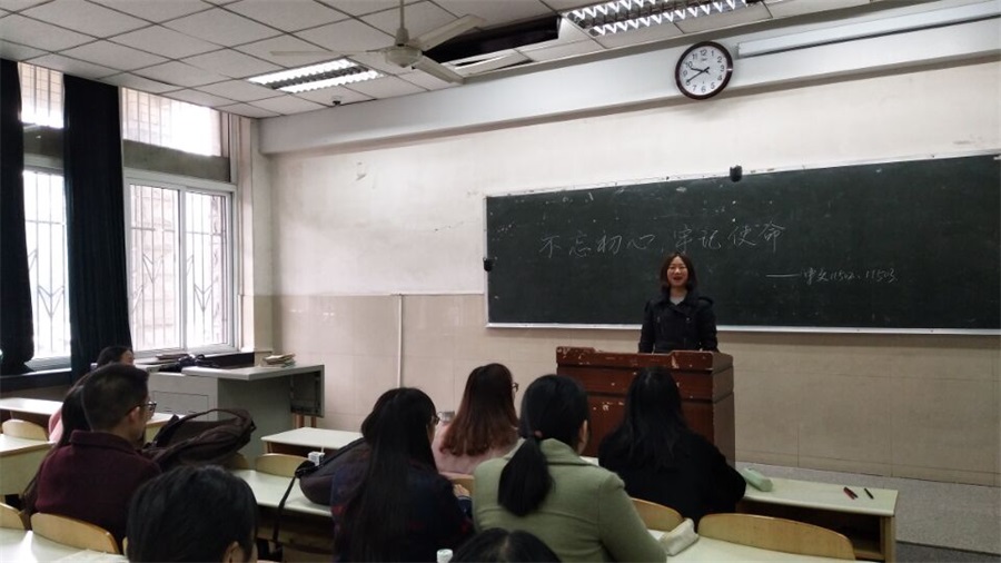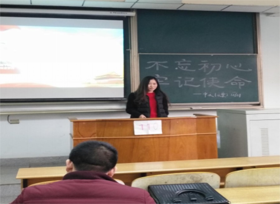 中文11503班徐鑫同学在发言中说道:不忘初心,继续前进,就意味着要牢记使命,忠诚一辈子、奉献一辈子,这也是作为学干的我对自己的要求。