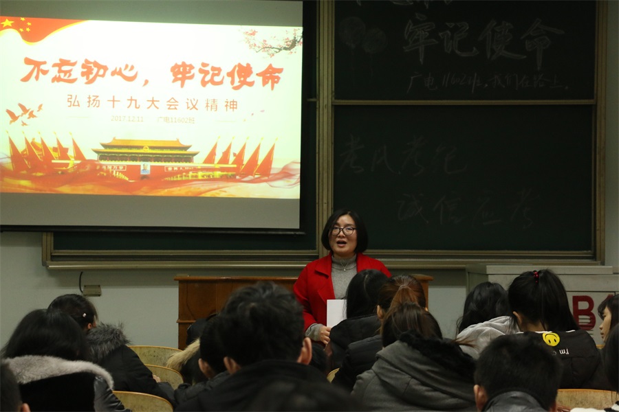 “不忘初心,牢记使命”主题团日活动。各团支部结合实际情况,以理论学习、交流分享、诗歌朗诵、重温入团誓词等方式学习党的十九大精神,学习习近平新时代中国特色社会主义思想。学院2个员工党支部、43个团支部,共计1400余名同学参加了此次活动。院团委负责人陈娟、各班主任老师分别深入各个团支部,与同学们面对面互动交流。