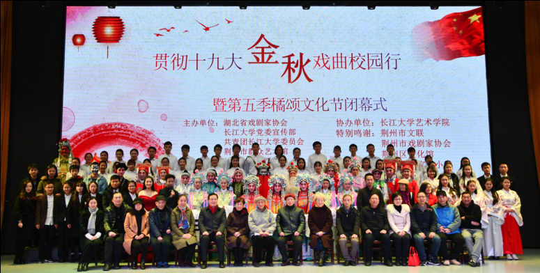 据悉,橘颂文化节是文学院每年的大型文化节,依托团队建设和社团文化,学院开展“三百篇、三笔字、普通话、辩论赛、戏曲进校园、话剧之夜、朗诵比赛、微电影比赛”等活动,其中戏剧晚会更是橘颂文化节中的重头戏。学院师生通过田野调查、拜师学艺、艺人与师生同台演出等方式将荆河戏、马山民歌等荆州非物质文化遗产进行活态传承,至今已有十余年。