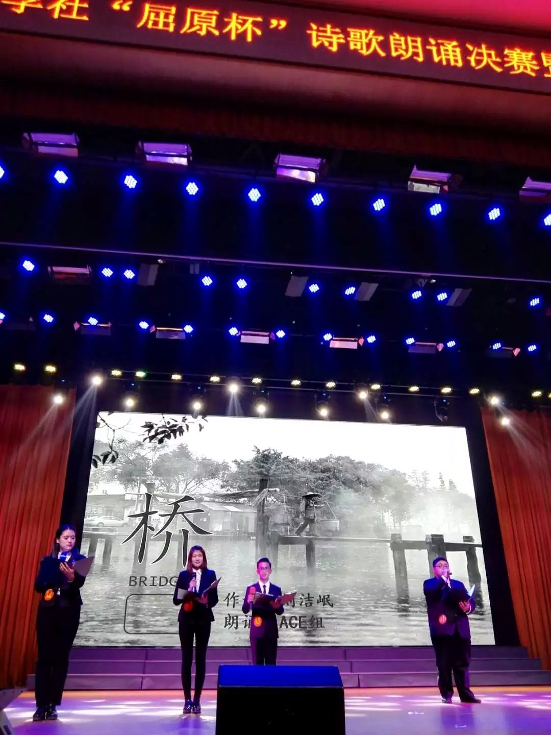 本场晚会分为朗诵决赛与原创诗歌颁奖两大部分。诗歌朗诵部分藉诵读著名诗人刘洁岷老师的诗歌作品,在荆楚大地传承屈原精神,提升长大校园文化品味。晚会开始,12名选手在歌声中闪亮登场,并依次以他们创造性的朗诵演绎了刘洁岷老师的长诗《桥》等作品;经过团体赛与个人赛两轮角逐,被认为音质优美、富有朗诵潜力以及对诗歌体悟到位的常天一同学夺得朗诵比赛的桂冠。