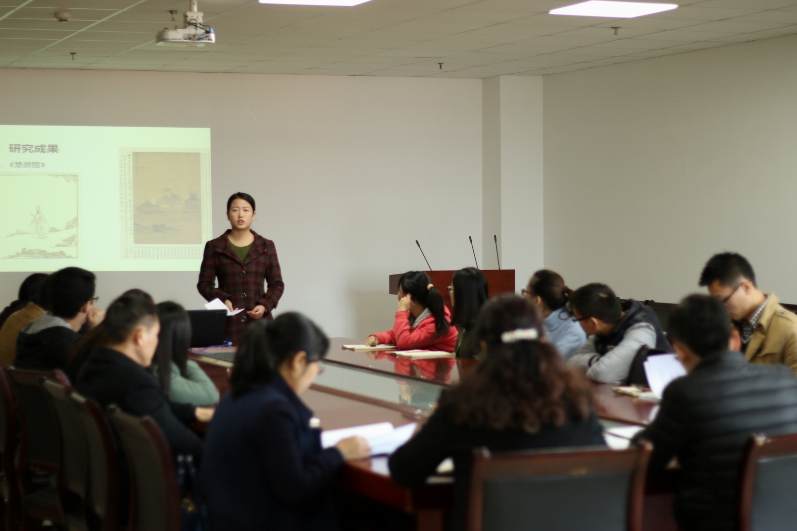 本次答辩主要分团队ppt展示和现场评委提问两个环节。由王军伟同学负责的《荆州市区地名命名的文化考察》创新项目计划详细地考察了47个荆州的古街道;何风同学负责的《玉台新咏》项目将咏妓诗作为研究对象;而龚玉明同学负责的《大学智慧校园设计》创业实战打造了集脱单表白、恋爱升温、情感疗伤于一体的创新服务平台;凌航同学的《十年》微视频创作项目则体现了年轻人视角下的打工生活。评委老师在审阅项目结题材料、听取项目答辩汇报、观看项目实物展示、询问项目研究情况等基础上,对项目实施情况进行了点评及打分,并针对问题的研究方法给予同学们相应的建议。