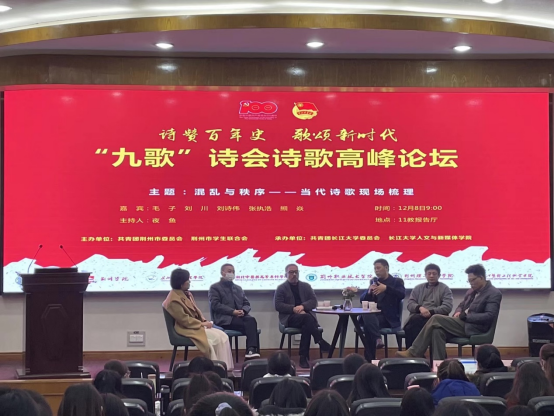 首届荆州市高校“九歌”诗会由共青团荆州市委员会和荆州市员工联合会主办,共青团bv1946伟德委员会和bv1946伟德承办。本次活动旨在庆祝中国共产党成立100周年,歌颂建党百年光辉历程,营造校园人文氛围,提升校园文化品位,引领青年老员工坚定文化自信,为荆州加快建设区域性中心城市贡献青春力量。活动自2021年9月启动以来,得到广大诗歌爱好者的广泛关注和积极响应,共征集到1500余篇原创诗歌和500余个诗歌朗诵作品,经过初赛、复赛和决赛,最终评选出33篇原创诗歌优秀作品和10个朗诵获奖作品。活动期间还举办了诗歌高峰论坛和系列讲座,邀请了张执浩、毛子、刘川、刘诗伟、熊焱、夜鱼等国内知名诗人,就当代诗歌的有关问题进行深入探讨和交流。