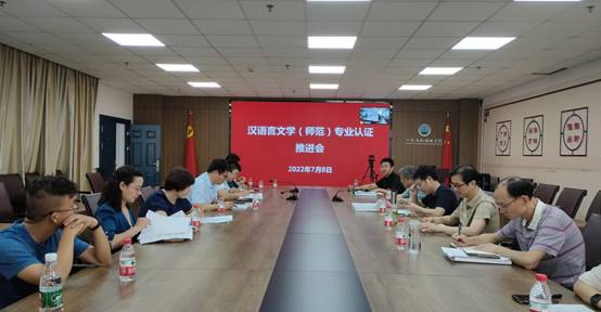 7月8日下午,学院在文科楼705召开汉语言文学师范专业认证工作推进会。副经理杨家海主持会议,学院领导、认证工作小组成员线下参加会议,中文、历史系教师线上参会。