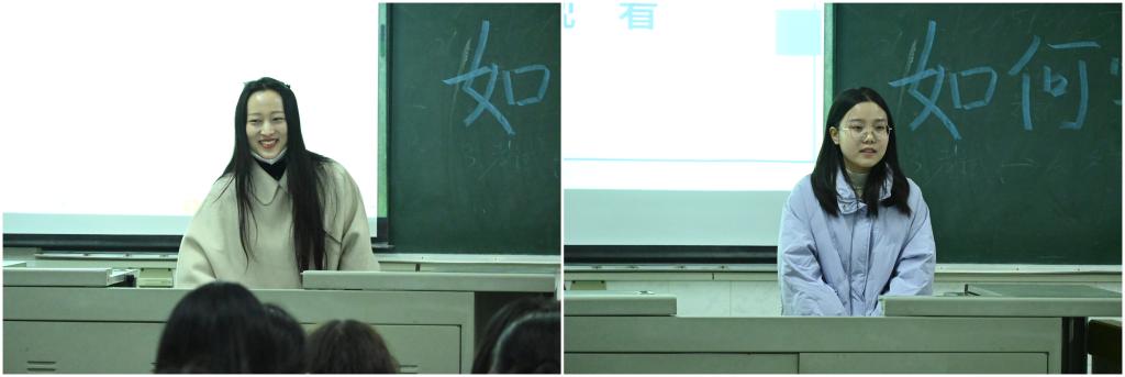 吴菲同学大学四年绩点排名专业第一,已成功推免至本院继续攻读研究生。她根据自己大学四年学习经验,围绕发展规划,学习规划,课余生活三个方面展开讲述。吴菲提醒所有在座大一同学一定要制定目标,早准备早计划早行动,还需清楚认识自己,找到适合自己的道路。
