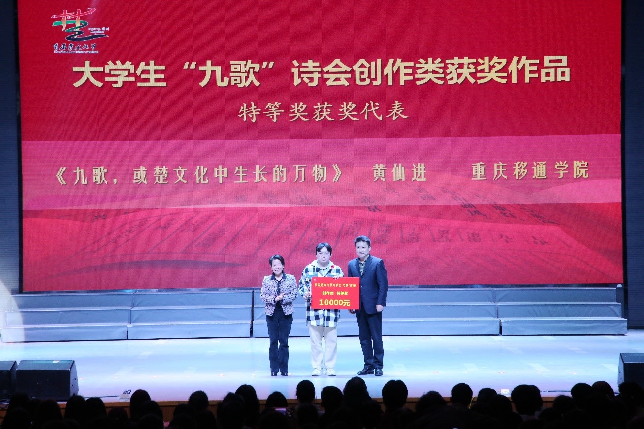 荆州市相关部门领导与在荆高校领导等为朗诵类获奖选手代表颁奖。