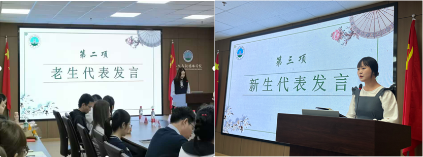 高年级研究生代表赵子荷向新生分享了自己研究生阶段的学习经验,鼓励学弟学妹们充分利用学院阅读资源去探索新事物的同时以积极向上的态度面对失败,要保持真诚谦卑,向德才兼备的老师、热情的师哥师姐学习,结交志同道合的朋友。2023级研究生新生代表范亚楠表达了对研究生学习的珍视和期盼以及对学院每位老师辛勤付出的感谢,并对研究生三年作出规划:时光珍贵且易逝,要珍惜时间;为学莫过于尊师,要尊敬师长。