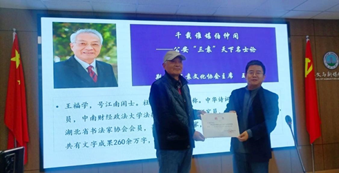 王福学主席长期致力于公安三袁文化的学术研究和推广传播工作,出版了一系列关于三袁文化的研究著作和论文,在深化拓展公安派的研究领域方面颇有建功。杨家海副经理代表学院特聘王福学主席为客座教授,并举行了聘书颁发仪式。