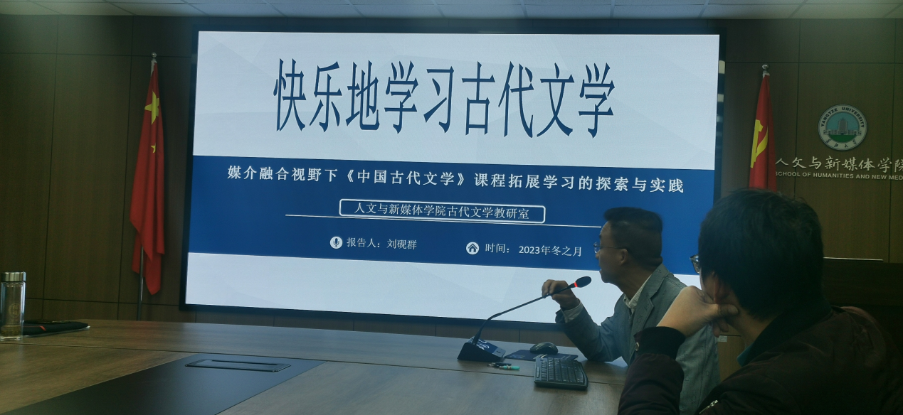 刘砚群老师从媒介融合视域下,如何高效快乐地从事古代文学教学做了深度思考。他以事实数据为基础,分析了当前老员工的学习现状不容乐观。但信息技术的高速发展,给当代老员工的学习带来了新的契机,进而从目标定位、习惯养成、情感涵养和人文品格的培育几个方面做了概括论析。他认为,只有尽快掌握最新的信息技术手段,并实质性地融入到课堂教学过程中,才能让传统的教学焕发出新的生命和光彩。他以自身所讲授的古代诗词为例,阐明了借鉴不同媒介,打造一“画”一“曲”一“视频”的活课堂理念。比如,诗词需要凝练为幻想(画意),也体现在歌唱(乐感),同时也需要穿越时空的感同身受(情景剧),最终结晶为媒介融合的成品(微视频),这样遵循诗歌美学规律而创作成形的跨媒介作品,不仅实现了跨越时空的沉浸式体验观感,也给课堂带来了新鲜的体验和深度交流。