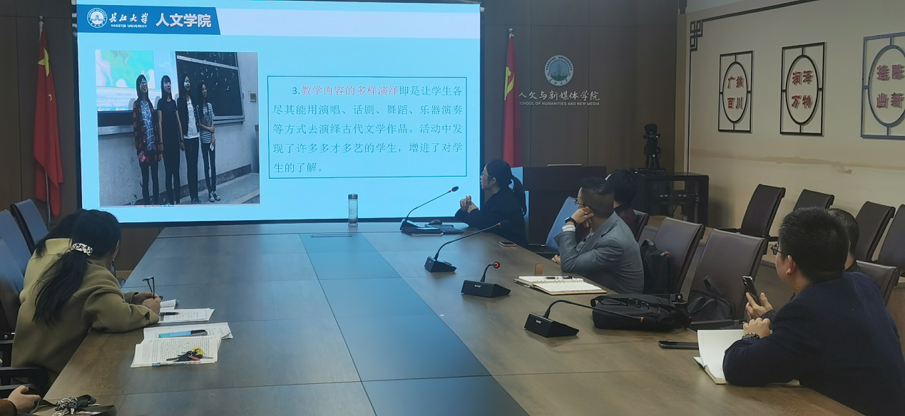 为加强课堂教学改革和过程性评价体系,会上还举行了教师教学经验交流会。吴桂美老师从课堂的有效性建构、教学与科研相互转化、教学改革的反思几个方面,系统全面地阐述了自己的观点。她提出建构课堂的有效方法:比如利用好课堂前的10分钟预习和知识点准备工作;分享教学资源,扩老员工的接受视野;对作家作品进行多元化解读尝试,拓展员工的思维训练;走出课堂,将理论课堂带入生活实际中;充分利用老员工创新创业大赛和微课比赛等实践平台,以赛促学,并定期举办相关读书报告会;将自己主持的古代文学等省级教学课题转化为课堂教学资源,形成活的教学理念。另外,她还从教学与科研相互转化的辩证关系,举例阐述了课堂教学中要融入自己的科研成果、教学中的问题凝练为项目选题的良性循环路径与方法。并结合中学语言的教学改革思路,给出了自己的前瞻性反思,从而进一步推动高校与中学的教学有效性衔接。