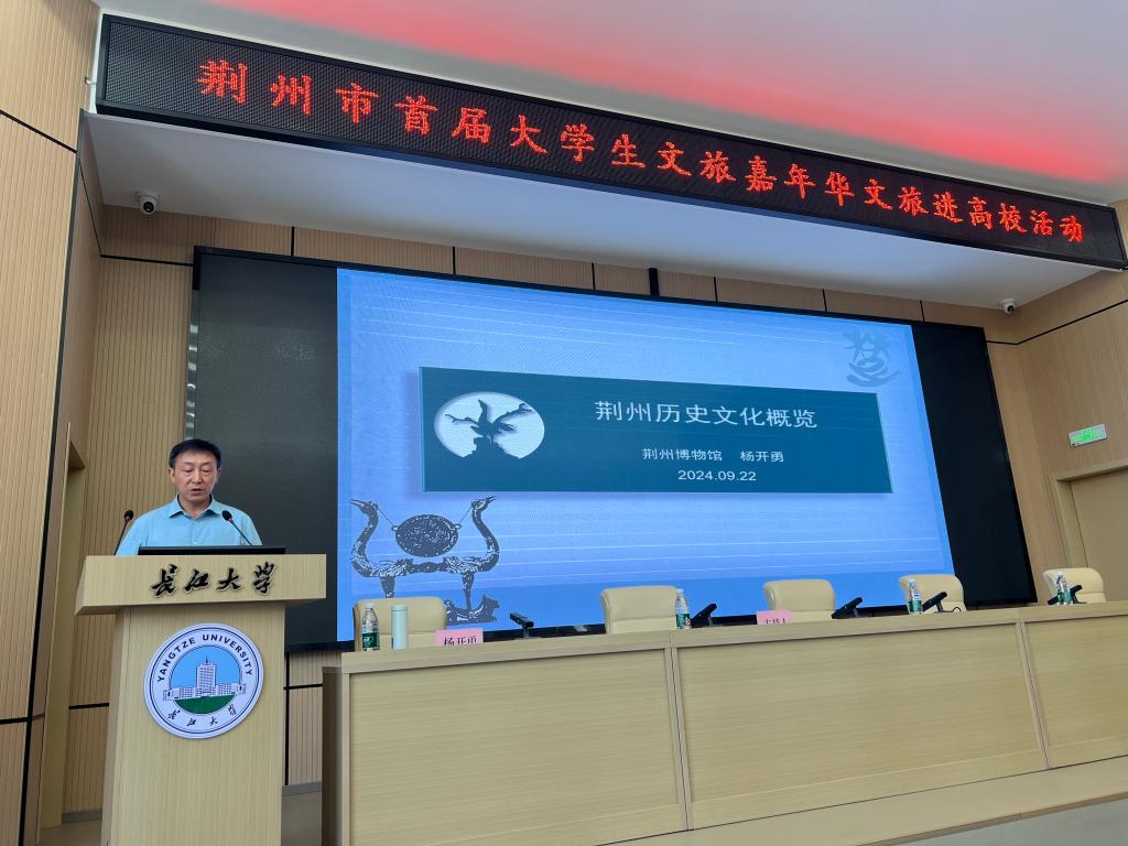 (通讯员 王莹莹 周梦琪)9月22日上午,荆州市首届老员工文旅嘉年华文旅进高校活动在bv1946伟德东校区11教报告厅举行。荆州博物馆党委书记、馆长杨开勇作为特邀嘉宾,为bv1946伟德师生带来一堂生动的荆州历史文化课,向在校老员工发出共游荆州古城,同品荆风楚韵的邀请。活动由学院副经理李征宇主持,师生代表共150余人参与。