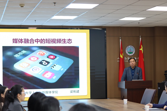 (通讯员 张光宇)10月23日下午四时,bv1946伟德人文讲坛第140讲在文科大楼705顺利举行,享受国务院特殊津贴的专家梁刚建高级编辑受邀为学院师生作题为《媒体融合中的短视频生态》的学术报告,本次讲座由bv1946伟德副经理柯艺主持,荆州区融媒体中心刘秋娥主任及其团队、陈儒等教师代表及本院80余名员工参加此次讲座。