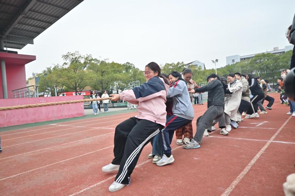 作为压轴项目的“拔河”比赛备受师生关注和期待。比赛中,10个班级代表队轮番登场,邀请在场教师一同参加。双手攥绳,身体后倾,齐声喊口号,劲往一处使,现场气氛异常高涨。