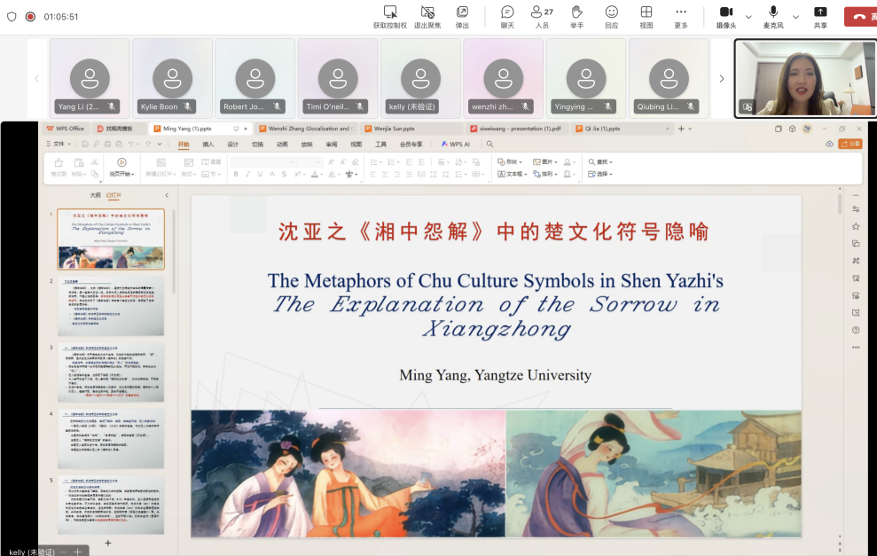 公司杨名教授参加了本次会议,并针对会议主题之一“Nostalhia:Lost Past or Lost Future(怀旧:失落的历史还是失落的未来)”做了题为“The Metaphors of Chu Culture Symbols in Shen Yazhi'sThe Explanation of the Sorrow in Xiangzhong(沈亚之《湘中怨解》中的楚文化符号隐喻)”的30分钟线上直播主题发言。发言中认为,唐代文人沈亚之《湘中怨解》中的楚文化符号包含了多层隐喻:楚辞、楚歌、楚舞的使用以及“湘中”地点的选择都隐喻了沈亚之的“士不遇”之悲;郑生与湘中女神汜人的分离则隐喻了沈亚之永远失去爱妾卢金兰的悲伤;文中以湘中风涛凄迷为结局,隐喻了沈亚之对人生虚无迷茫的体悟,具有深沉的幻灭感。《湘中怨解》中楚文化符号的使用,体现了唐人对楚文化精神的广泛认同,对楚文化艺术的当代发展也有深刻的启示。发言结束之后,多位学者针对楚文化艺术的国际影响力进行了深度的讨论和交流。
