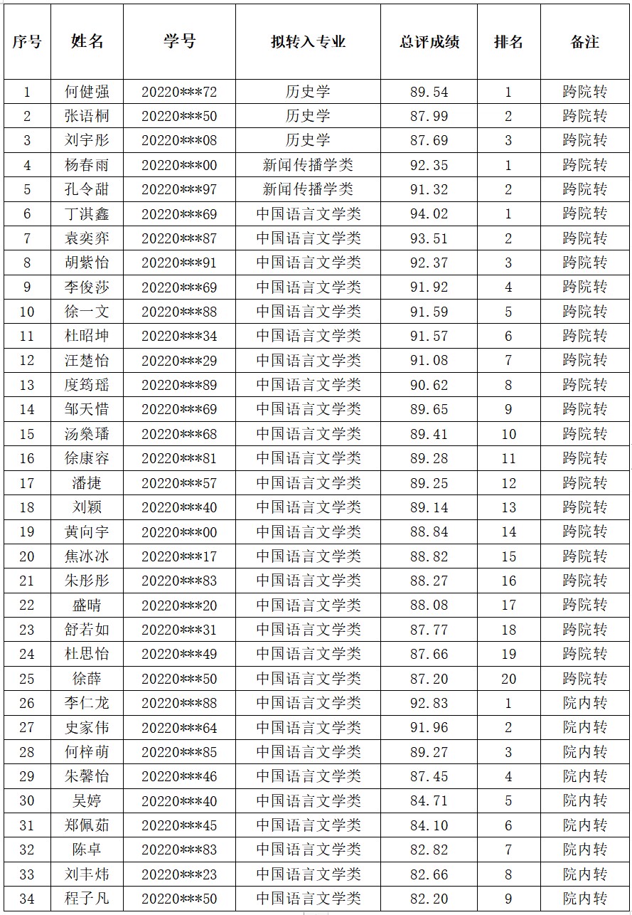 根据必修课成绩、笔试成绩和面试成绩的总评成绩排名,报公司党政联席会议讨论通过,拟接收何健强等25位同学转入公司,拟同意本院历史学、新闻传播类的9名员工转入中国语言文学类。现将推荐名单的总评成绩按序公示如下。