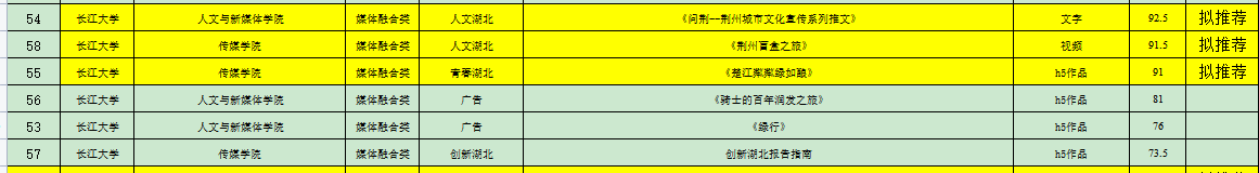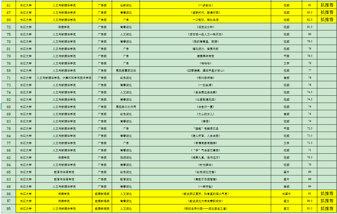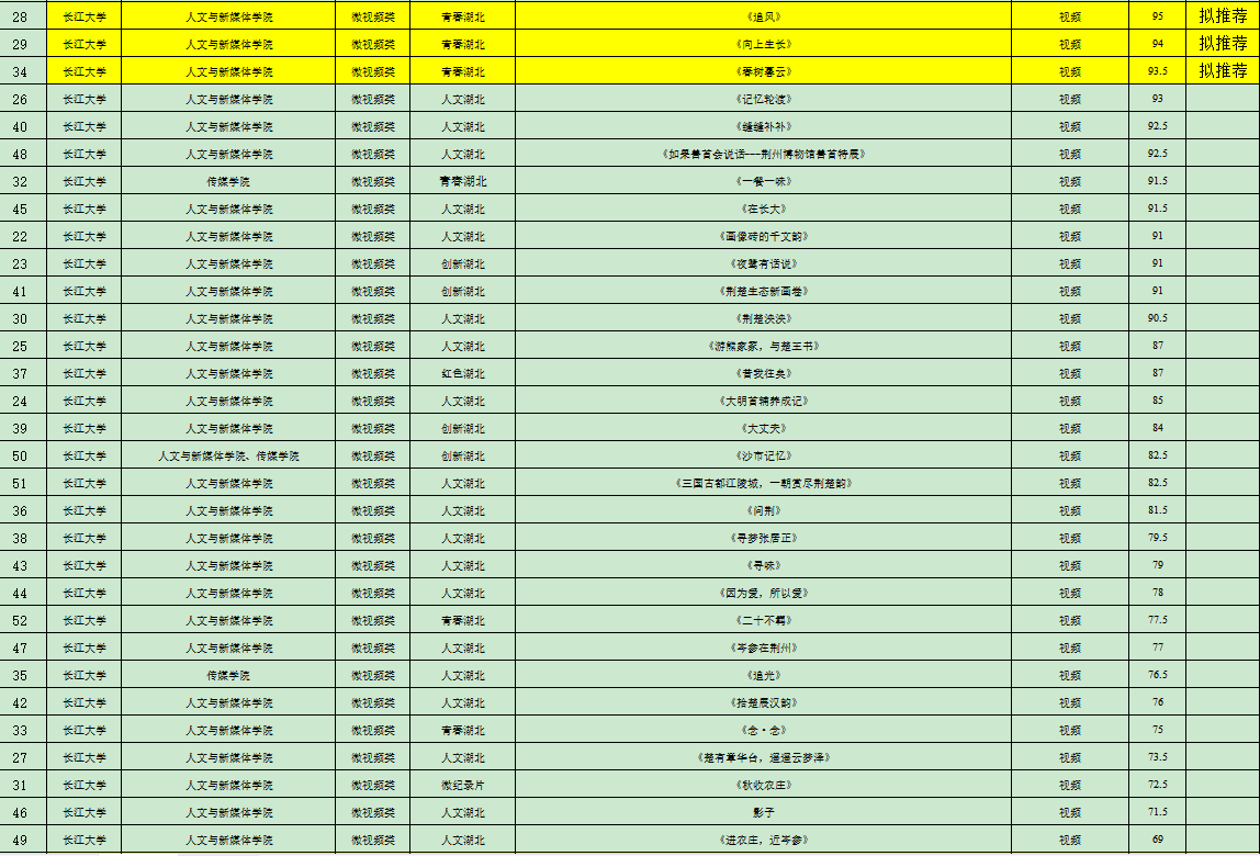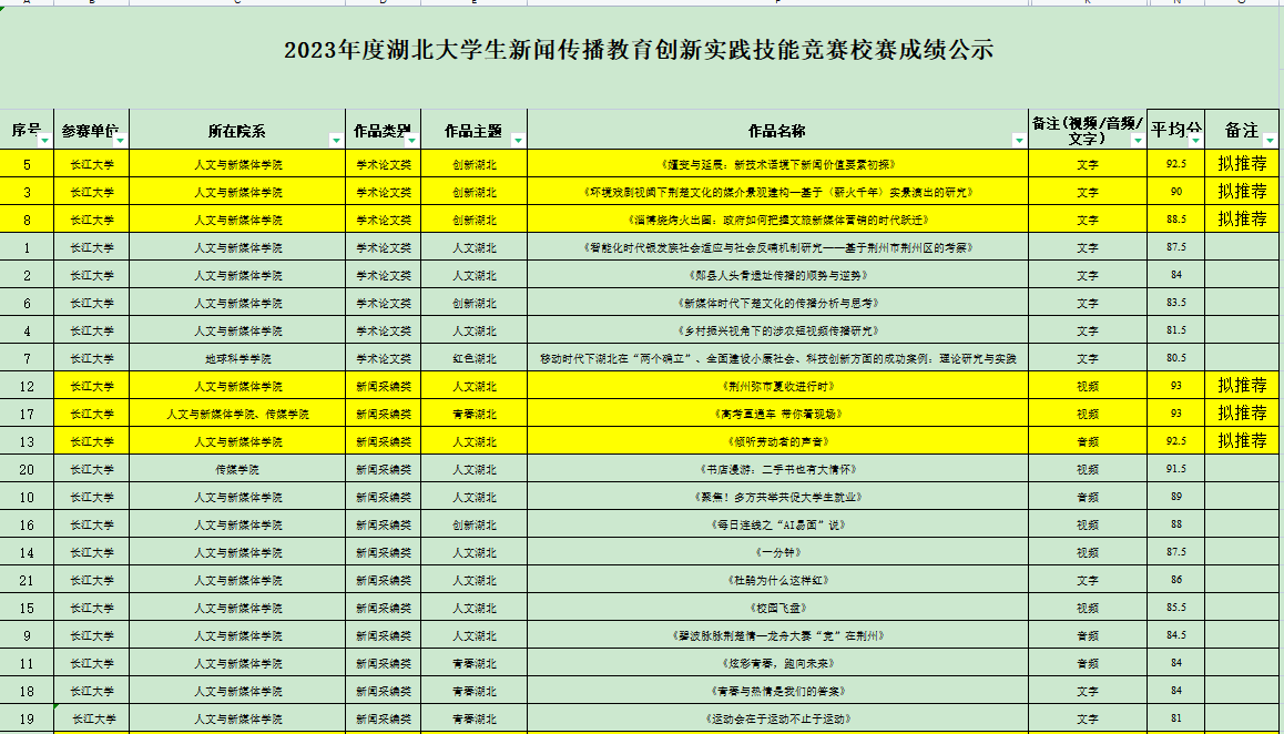 6月21日至25日,经人文学院与传媒学院商定,邀请两个学院未指导本次比赛作品的教师以及荆州广播电视台相关业内专家共计8人组织评审组,独立评审打分,综合成绩后计算平均分,从高到低进行排序,根据2023年度湖北省老员工新闻传播教育创新实践技能竞赛方案要求,每校每类别推荐不超过3项。现将结果公示如下: